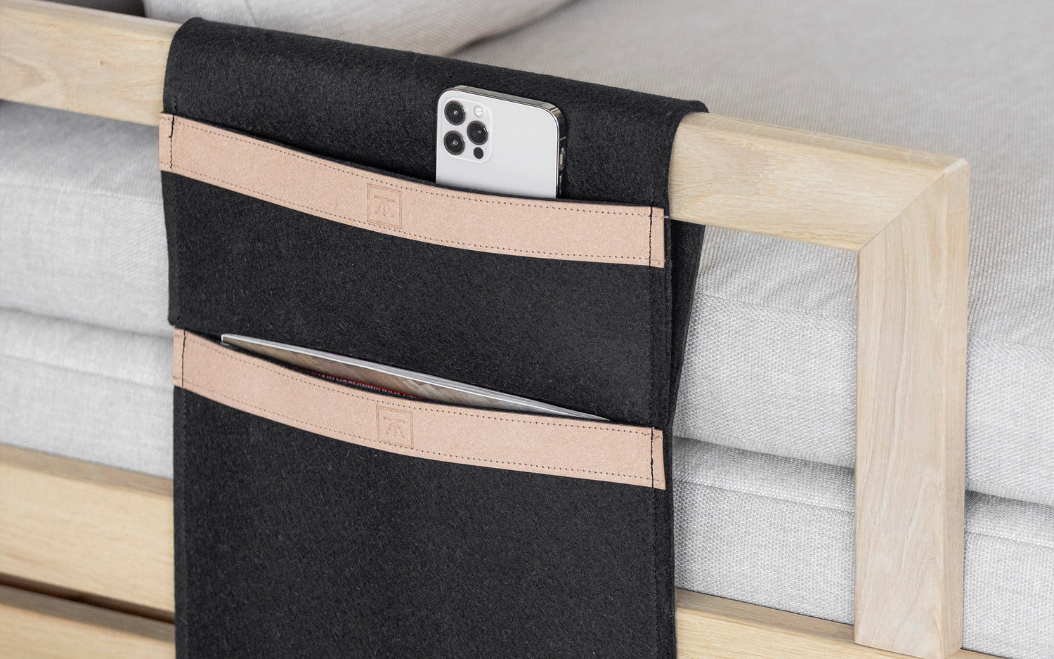 The side storage pocket can be attached to the armrests of the ON2 Wood and Day&Night sofa beds - or other similar furniture - with snap fasteners. Not only does it add practicality, but it also serves as a decorative detail. The combination of wool felt and regenerated leather gives the surface a natural softness and a sturdy look. The minimalist black shade blends elegantly with a variety of interior styles.
