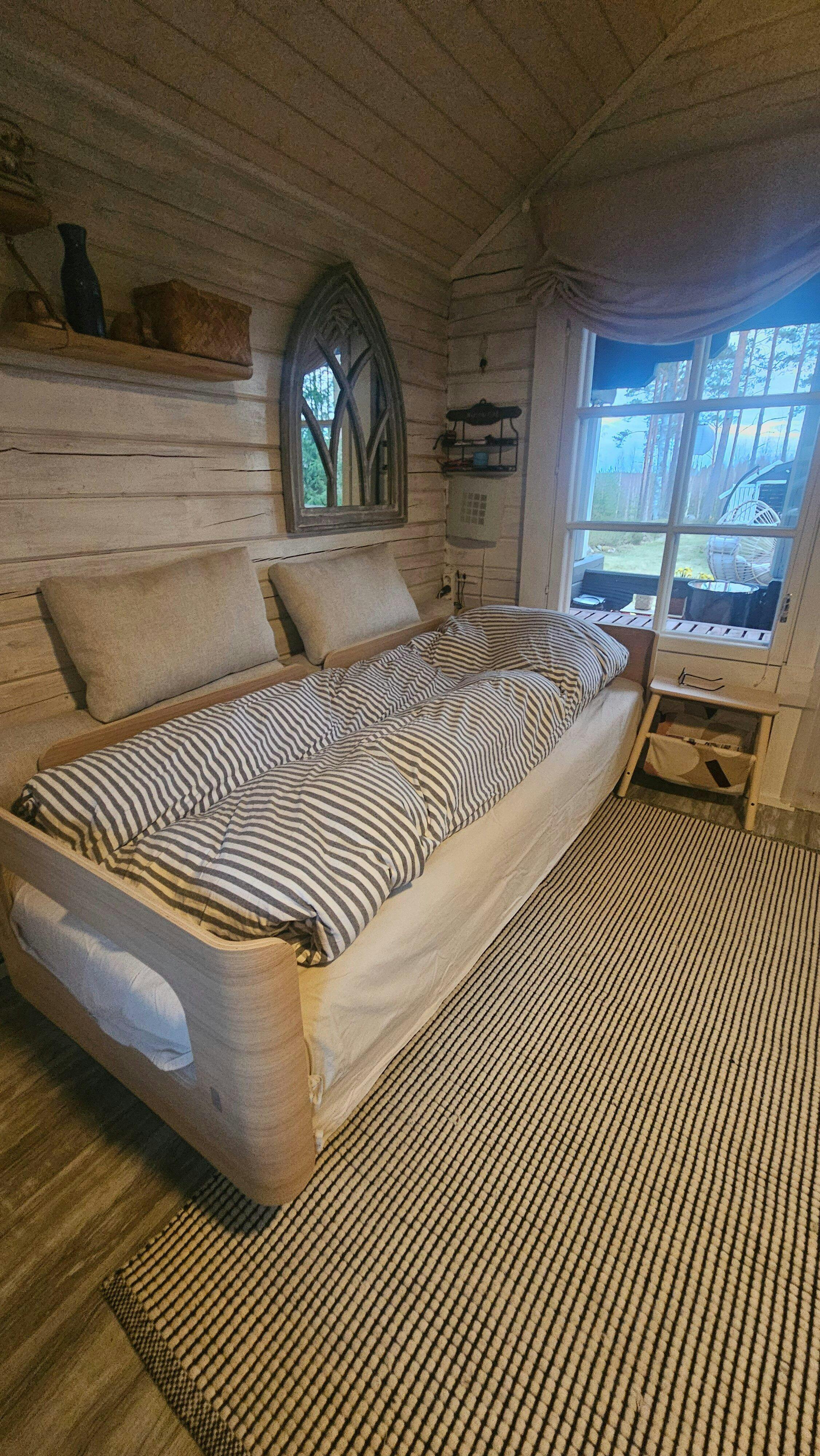 Kätevä vuode vieraille kaunis muotoilu ja voi nukkua parivuoteena tai erikseen siirrettynä👍