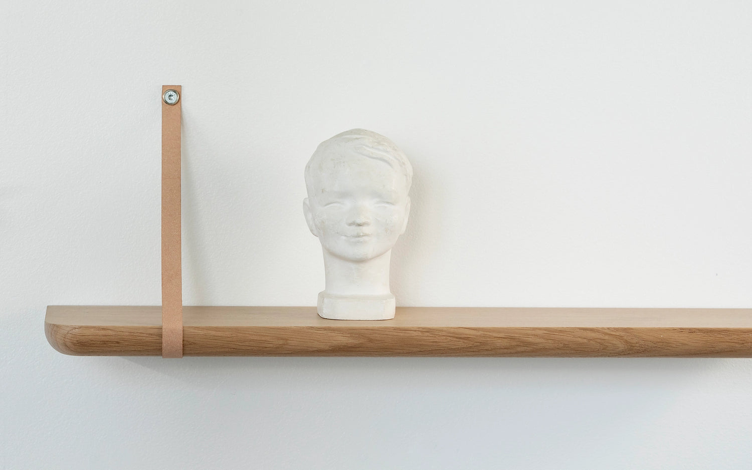 A wall-mounted leather strap and solid oak shelf create a timeless combination. The softly contoured straps add an interesting detail to the interior, and the shelf provides space for books, houseplants, decorative objects or everyday items, depending on your needs.