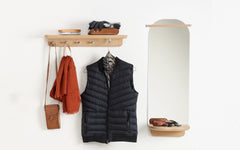 Renki-peili täydentää kokonaisuuden tuoden eteiseen valoa ja tilantuntua. Peilin mukana tuleva massiivitammesta valmistettu hylly toimii laskupaikkana avaimille tai pienille koriste-esineille, ja puu antaa sisustukseen lisää aina kaivattua lämpöä.