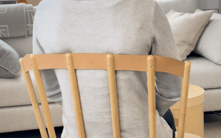 Selkänojan joustavat pinnat mukailevat istujan selkää, tarjoten ainutlaatuista istuinmukavuutta. Pystypinnat on sidottu yläreunasta luonnonvärisellä nahkanauhalla, joka on muun nahkatuotannon ylijäämästä valmistettua uusionahkaa.