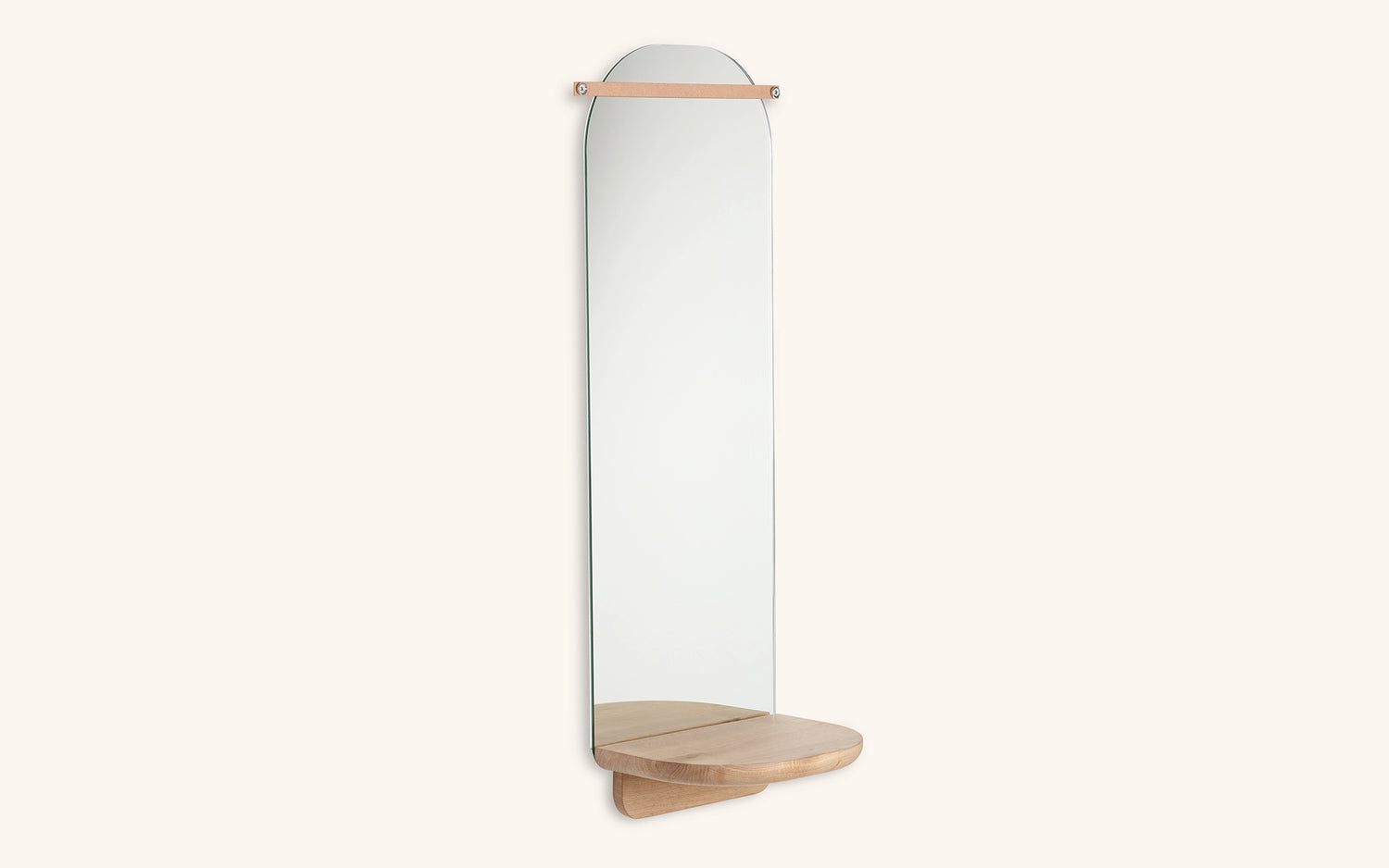 Peilin mukana tuleva massiivitammesta valmistettu hylly tuo luonnonläheisyyttä ja toimii täydellisesti alustana niin koriste-esineille kuin päivittäin käytettäville tavaroille. Uusionahkainen tukiremmi lisää ripauksen uniikkia ilmettä, ja samalla se varmistaa peilin tukevan kiinnityksen.